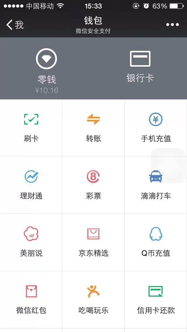 4、钱包也做了小的改动,首页只有显示零钱和银行卡,刷卡和转账的功能放到了下面。